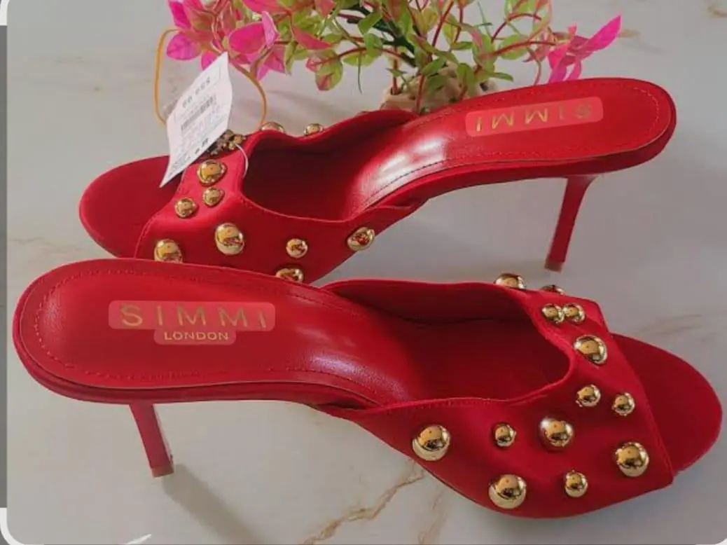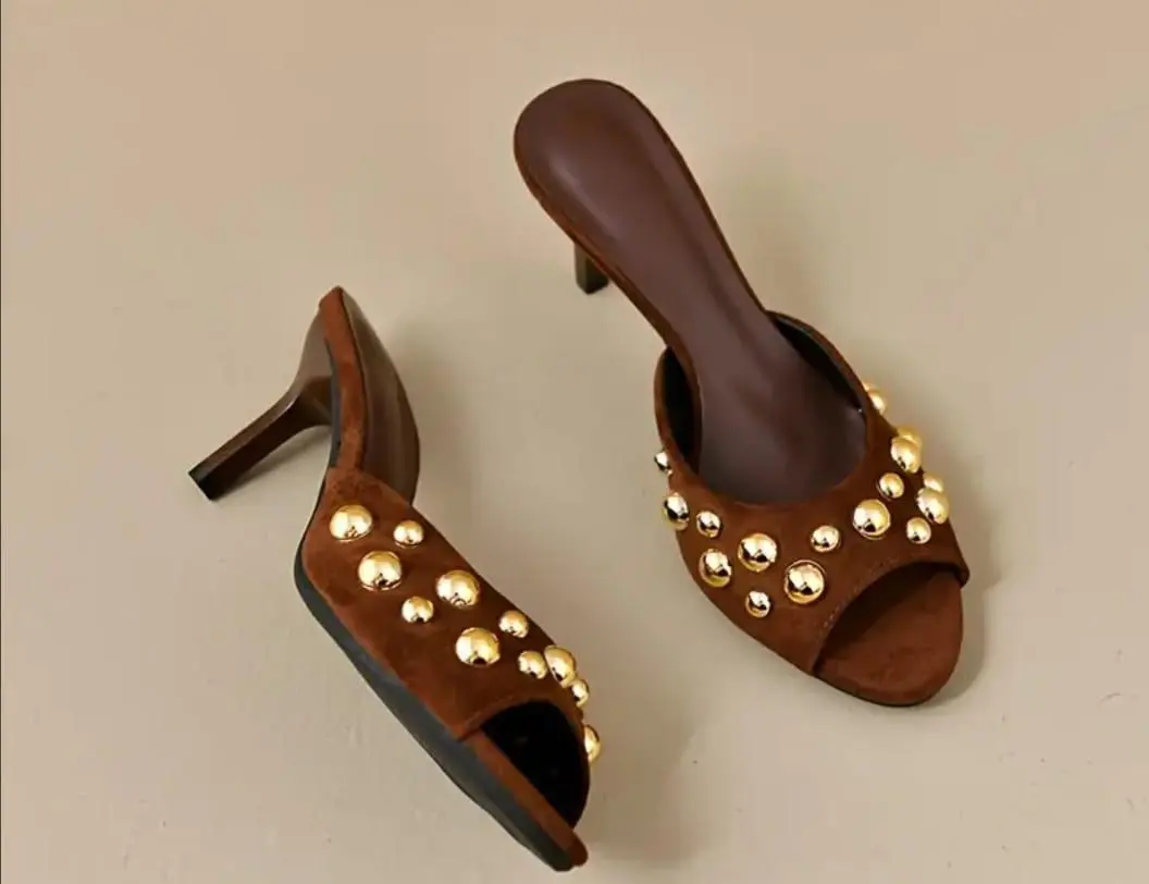 Chaussures talons aiguilles mules ornés de clous dorés. Ce modèle se caractérise par un design à bout ouvert et un talon aiguille élégant.